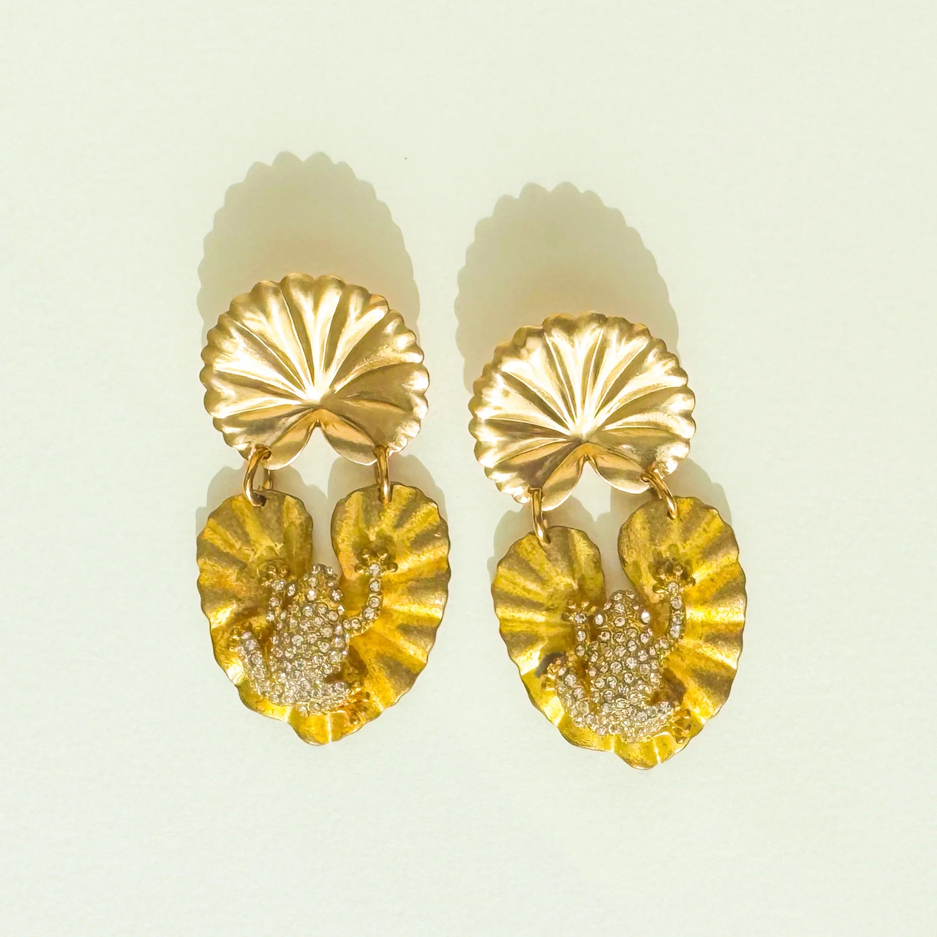 Add a little natural wonder to your look. Frogs perched on lily pads are studded with hand-set crystals. Hand cast in reclaimed brass. Sterling silver posts. Nickel and lead-free. 6.5...