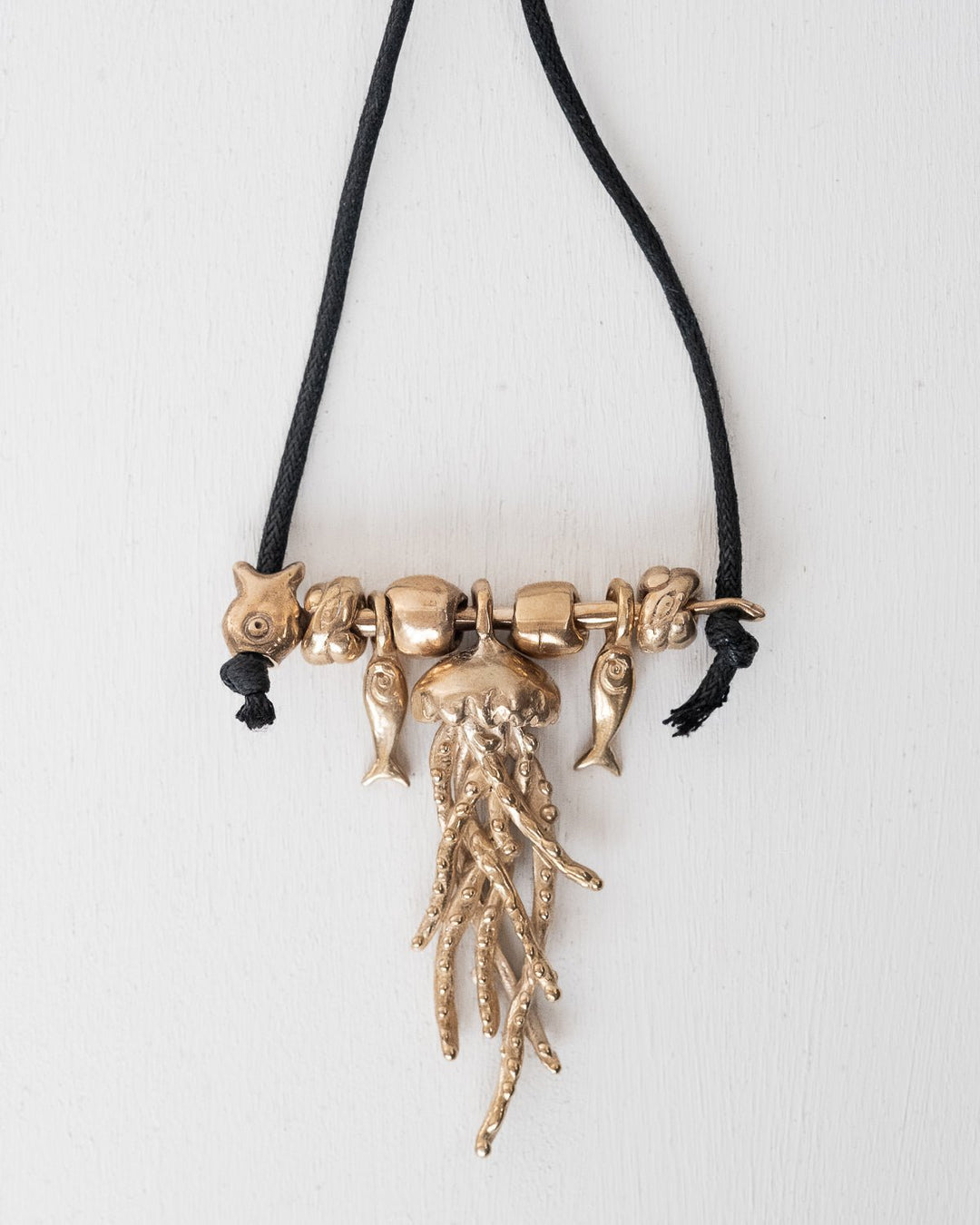 This unique piece by Pesci Che Volano features a detailed silver flat fish and a hanging bronze star on an adjustable tan cord, perfect for a distinctive look.